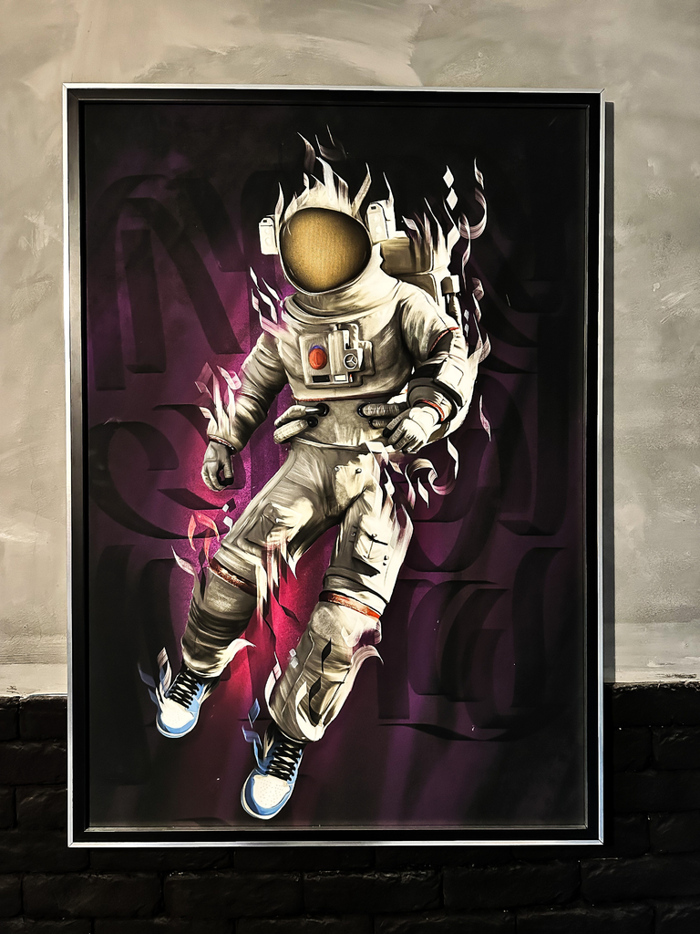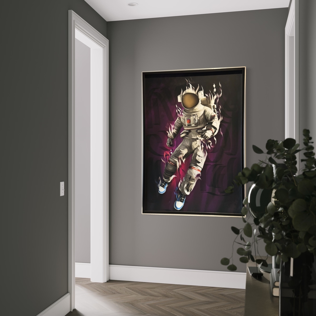 Inspirado em neil arsmstrong conhecido como the first man, essa obra retrata o primeiro astronauta fazendo a famosa e iconica caminhada na lua misturado com elementos da cultura pop! a obra e feita digitalmente e sofre intervensão artistica como aerografia, canetas posca, folha ouro tintas acrilicas e spray neon. A obra leva tripla camada de verniz acrilico podendo ficar exposta ao tempo sem preocupaçoes e sem necessidade de vidro.